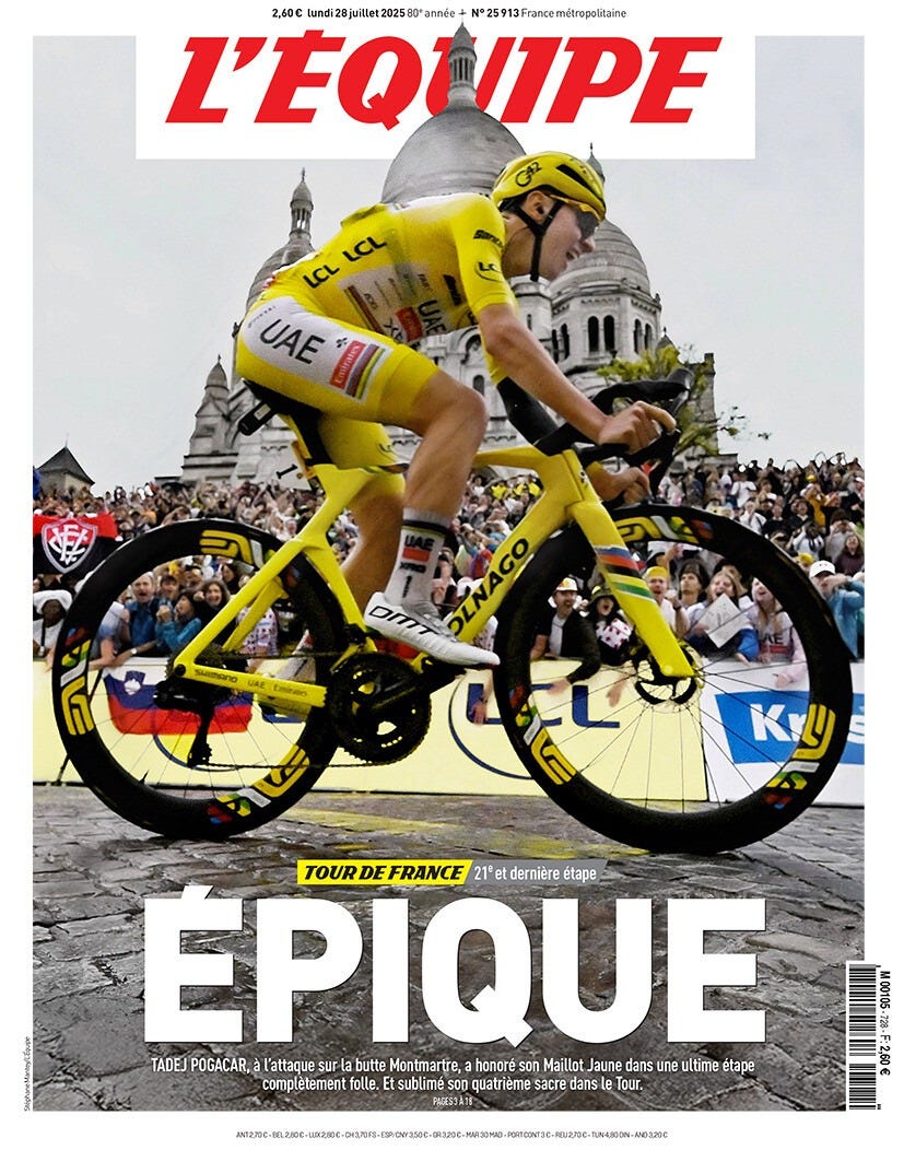 I enjoyed this final stage more than almost any other in this Tour, and I think it encapsulates the strengths of this edition rather well. A relentless pace, real ambition, big names, and a highly entertaining fight for nearly every stage win – in contrast to the GC battle, which, in truth, ended back on the Hautacam stage, when Pogačar effectively sealed the Tour with nine stages still to go.